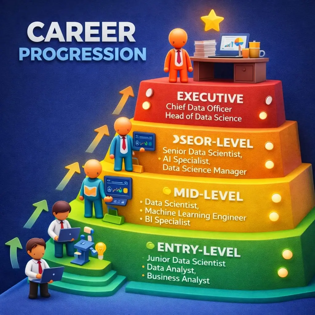 One of the biggest advantages of choosing data science as a career is flexibility and growth. You can progress into roles such as: